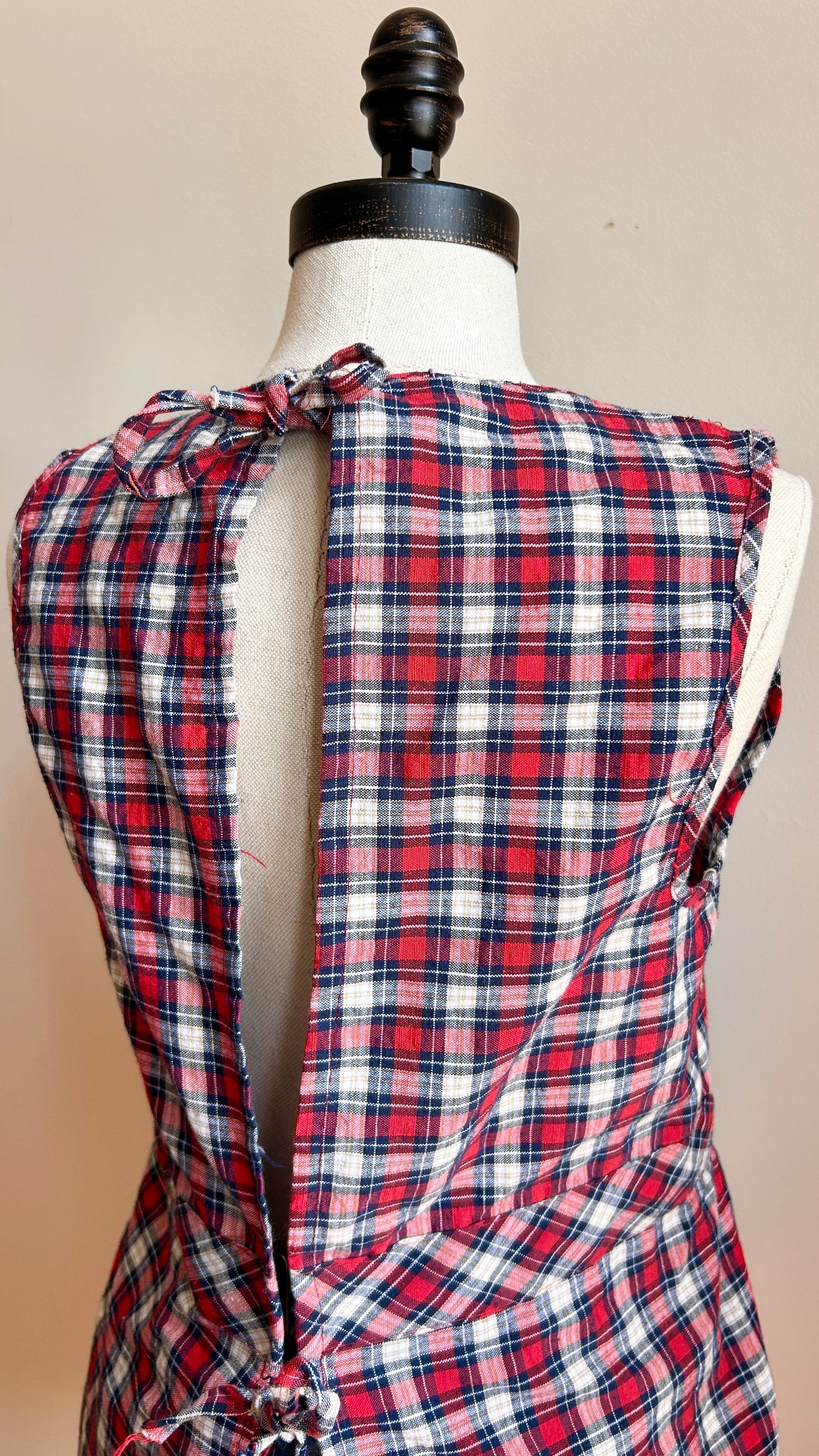 vintage 1960s red + navy plaid apron top with non-functional buttons down the front + an open back with tie closures