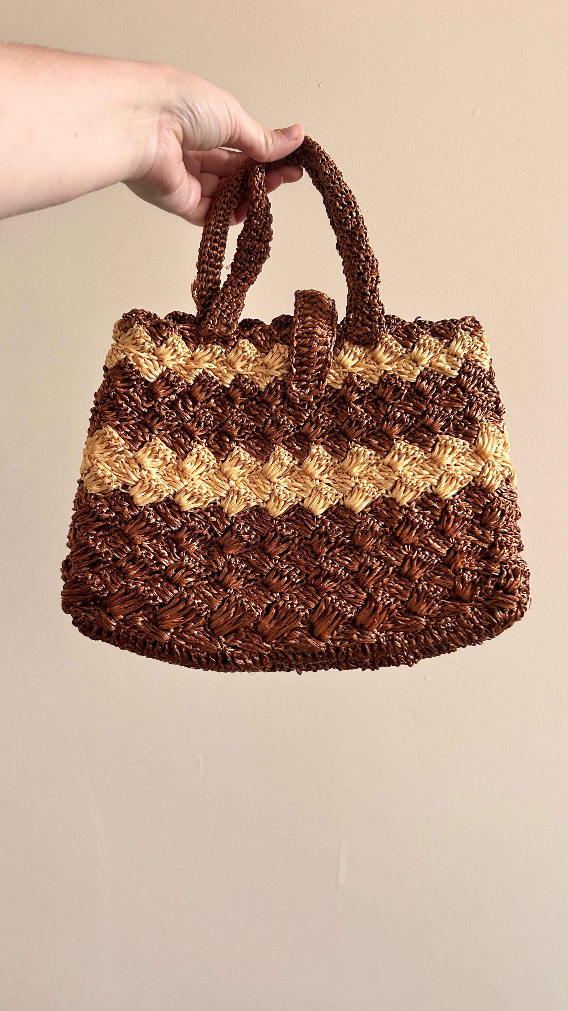 vintage 1970s brown + tan woven handbag with a toggle closure