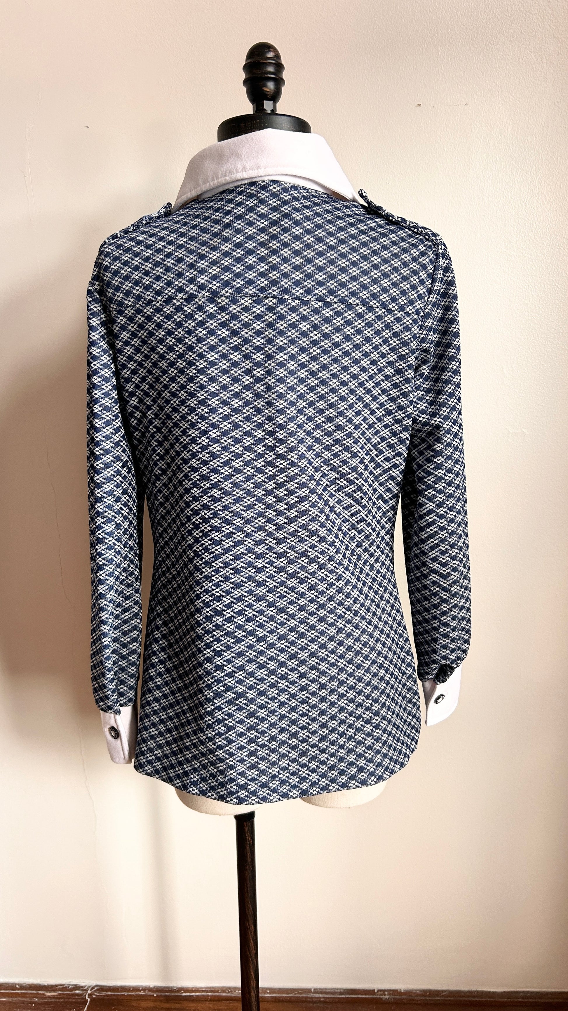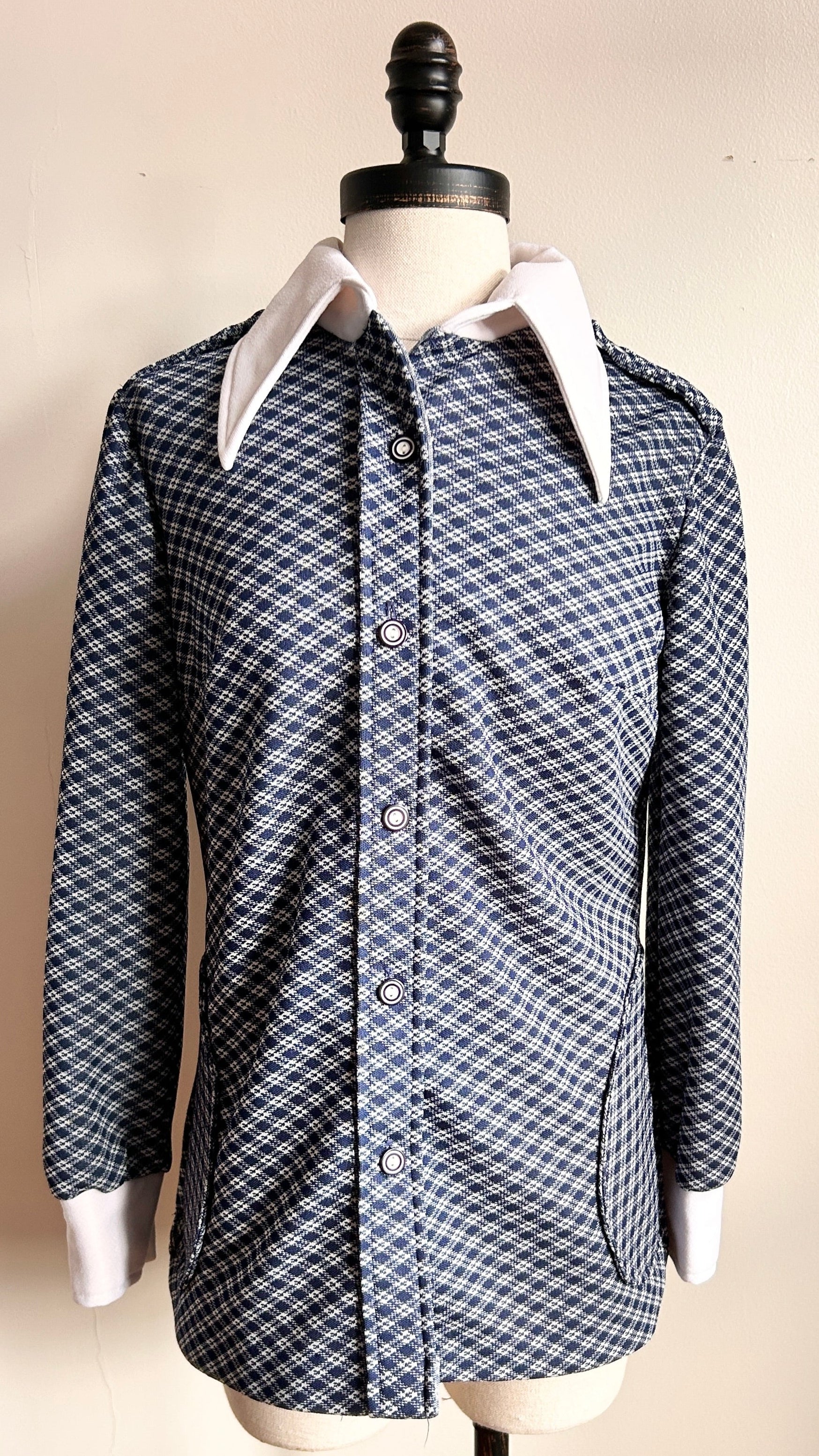 vintage 1970s navy plaid shirt with a white dagger collar, white sleeve cuffs, two side pockets, + buttons down the front