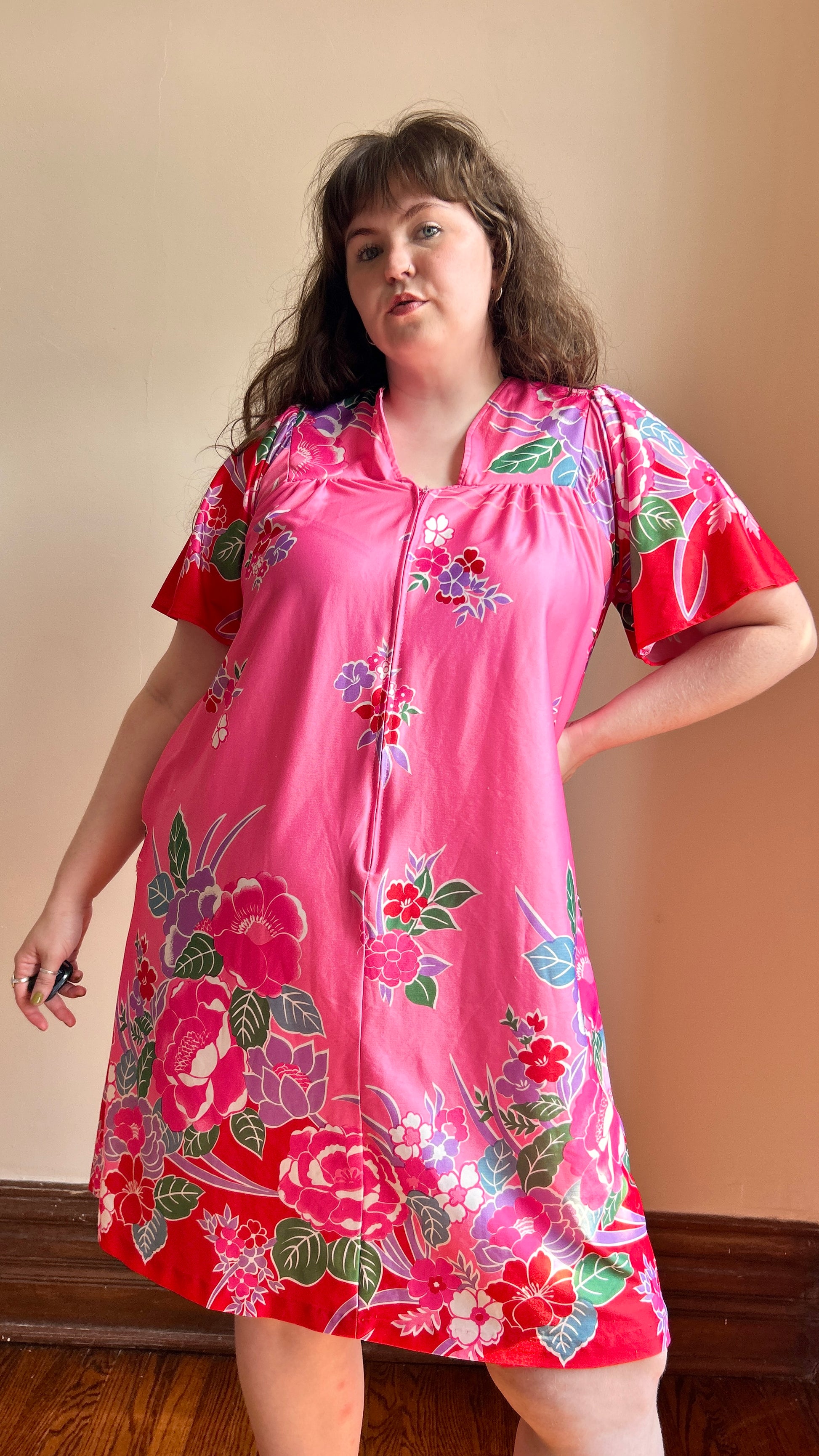 vintage 1970s pink floral caftan dress with a zipper down the front