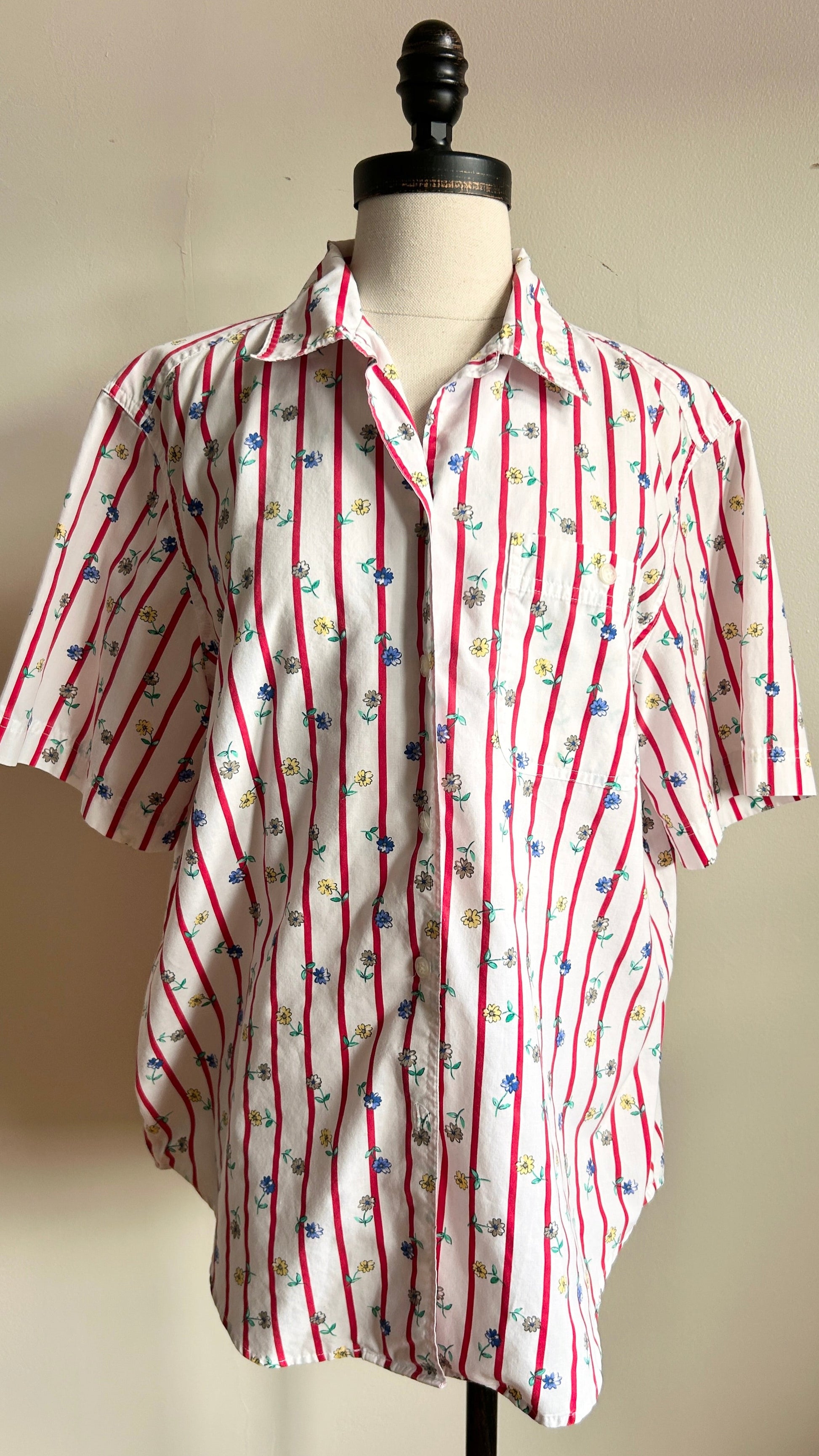 vintage 1990s white + red striped floral top with one chest pocket + buttons down the front